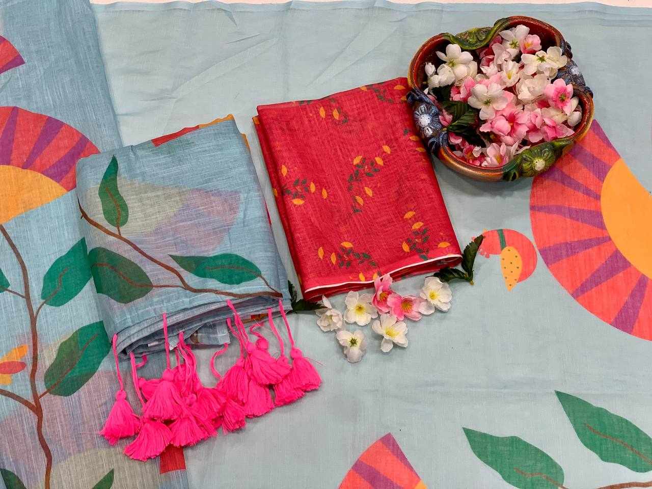 Saree Fabric: Premium Linen Cotton with beautiful digital print and elegant handmade cotton tassels